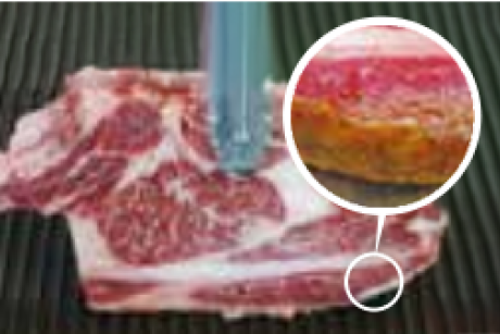 お肉をトングなどで立て、背中の脂から焼き始めます。
