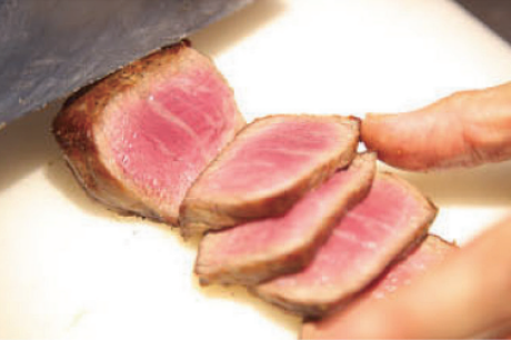 お肉を休ませた後、切り分ける。切った際、肉汁がほとんど出なければ、上手に焼けた証。