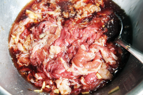 たれの材料をすべて合わせ、牛肉を冷蔵室で30分から1時間ほど漬け込みます。