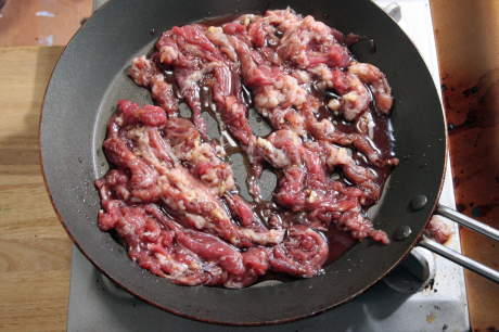 牛切り落とし肉は火の通りが早いので、やや弱めの強火で片面にしっかり焼き色が付くまで触らずに焼きます。焼き色が付いたら裏返し、さっと火を通して取り出します。