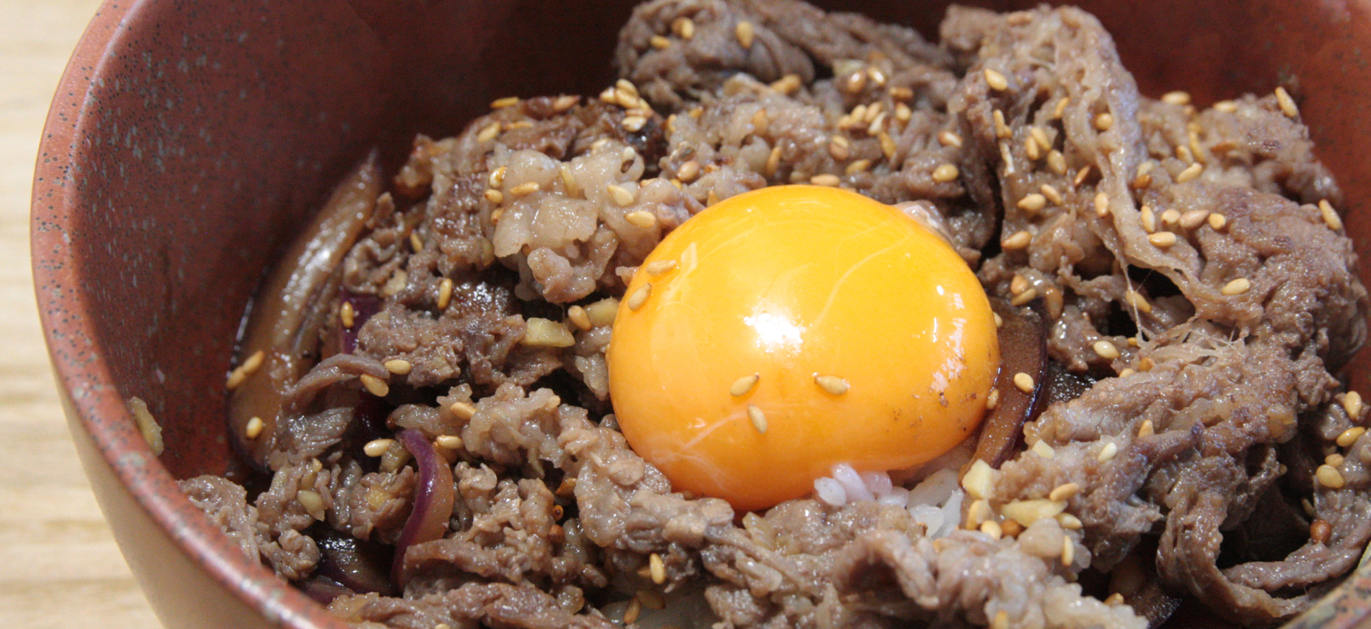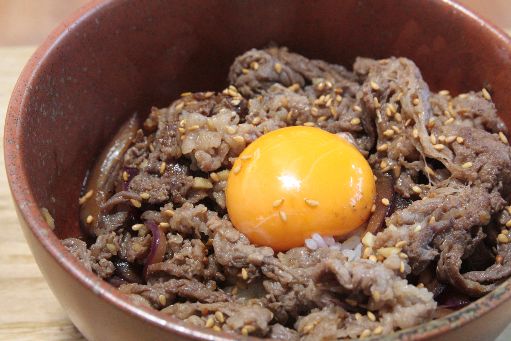 丼に熱々のごはんを盛り、❹のタレをかけます。その上に❸をタマネギ、肉の順で盛り付け、お好みで白いりごまや卵黄をトッピングしたら完成です。