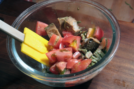 トマト、アボカド、赤タマネギに塩をひとつまみ加え、和えます。