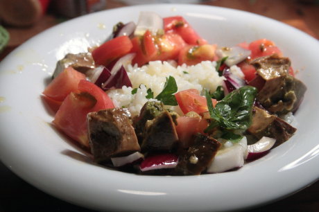 ❸のハーブライスの上に❹の牛肉を並べて、お好みでイタリアンパセリやバジルの葉をトッピングしたら完成です。